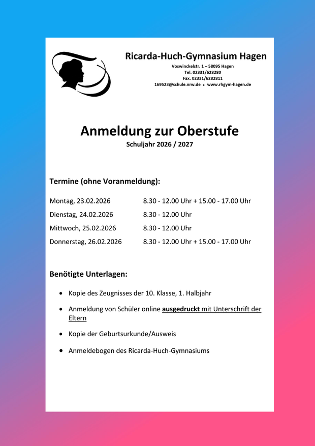 Weitergehende Rückfragen zum Anmelde- und Aufnahmeverfahren beantworten wir gerne über das Sekretariat unter Telefon 02331-628280 oder per E-Mail unter 169523@schule.nrw.de.