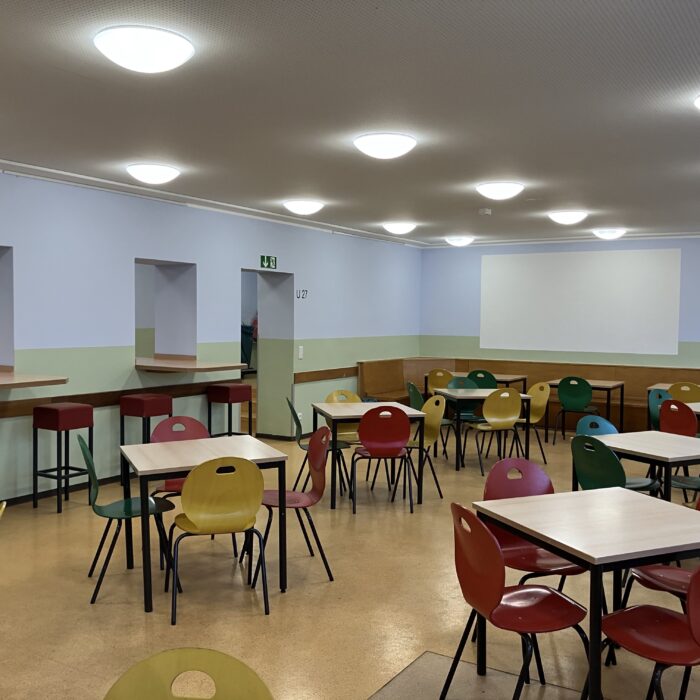 Die Cafeteria der Schule wurde renoviert. Die hellen und freundlichen Farben wurden von den Schülerinnen und Schülern selbst ausgewählt.