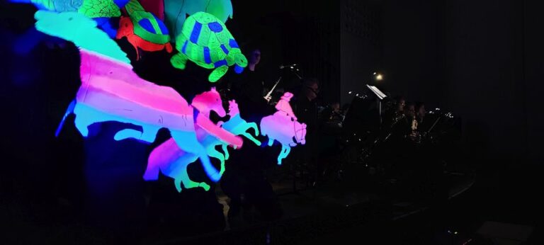 Wer sich fragte, warum dieser Platz frei blieb, der wurde bereits zu Beginn von der Kunstlehrerin am RHG, Susanna Wolff, aufgeklärt. „Im Rahmen des Großprojektes zum Karneval der Tiere wurde die Schwarzlicht-Installation wieder neu belebt,“ so Wolff. So teilten sich die Schülerinnen und Schüler, mit ihren leuchtenden Tieren, die Bühne mit den Musikern und alles zusammen verband sich zu einem mehrdimensionalen Kunstwerk.