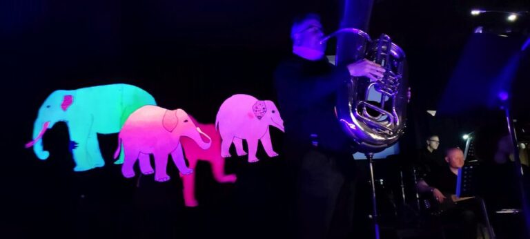 Die Dimensionen des Projektes, welches im Programm „Kultur und Schule“ von der Landesregierung gefördert wurde, lassen sich bereits erahnen, wenn man die Mitwirkenden und den zeitlichen Rahmen betrachtet. Auf der einen Seite steht die Musik von Camille Saint-Saëns. Diese wurde von Stephan Mehl für die Big Band arrangiert und damit völlig neu instrumentiert. „Von Swing bis Hip-Hop ist jetzt alles dabei,“ beschreibt Mehl seine Big-Band-Bearbeitung. Und die Stücke haben es wirklich in sich: Wenn der Löwe brüllt, die wilden Pferde rennen und der Elefant – gespielt von der großen Tuba – ihren Auftritt haben, dann halten alle anderen den Atem an.