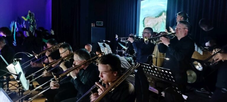 „Mitreißende Musik und Bilder zum Staunen“, so beschreibt es eine Zuschauerin, die wie viele andere den Weg in den vielleicht schönsten Konzertraum der Stadt Hagen gefunden hatte. Auf der Bühne der Aula – weithin sicht- und hörbar – die Big Band der Max-Reger-Musikschule unter der Leitung von Stephan Mehl. Aber der linke Teil der Bühne blieb leer.
